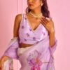 Women’s Pristine White Organza Saree with Exquisite Pink & Green Floral Thread Embroidery – Complete with Matching Embroidered Blouse for Festive & Summer Wear